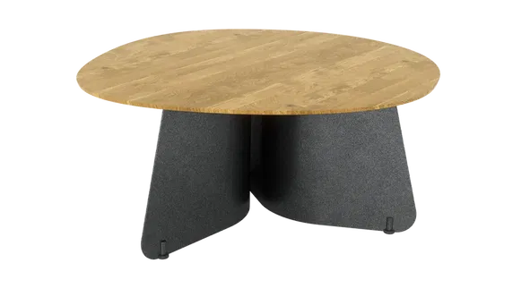 Table basse sculpturale Plateau de table verni mat Plateaux disponibles en 5 finitions en bois massif Plateau en bois massif de 25 mm avec arête suisse, associé à des joues en acier cintré de 4 mm d’épaisseur Base en acier, thermolaquée Base disponible en deux coloris.